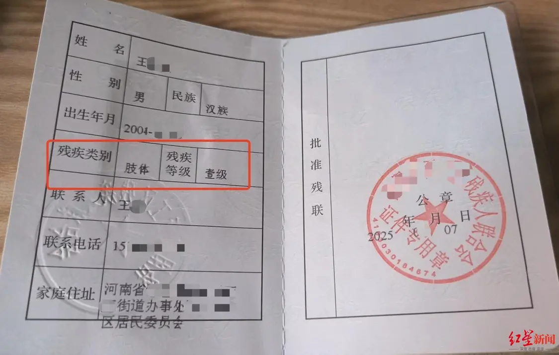 今年2月,老家残联为王辉办理了《残疾人证》,认定其为“肢体一级残疾”。