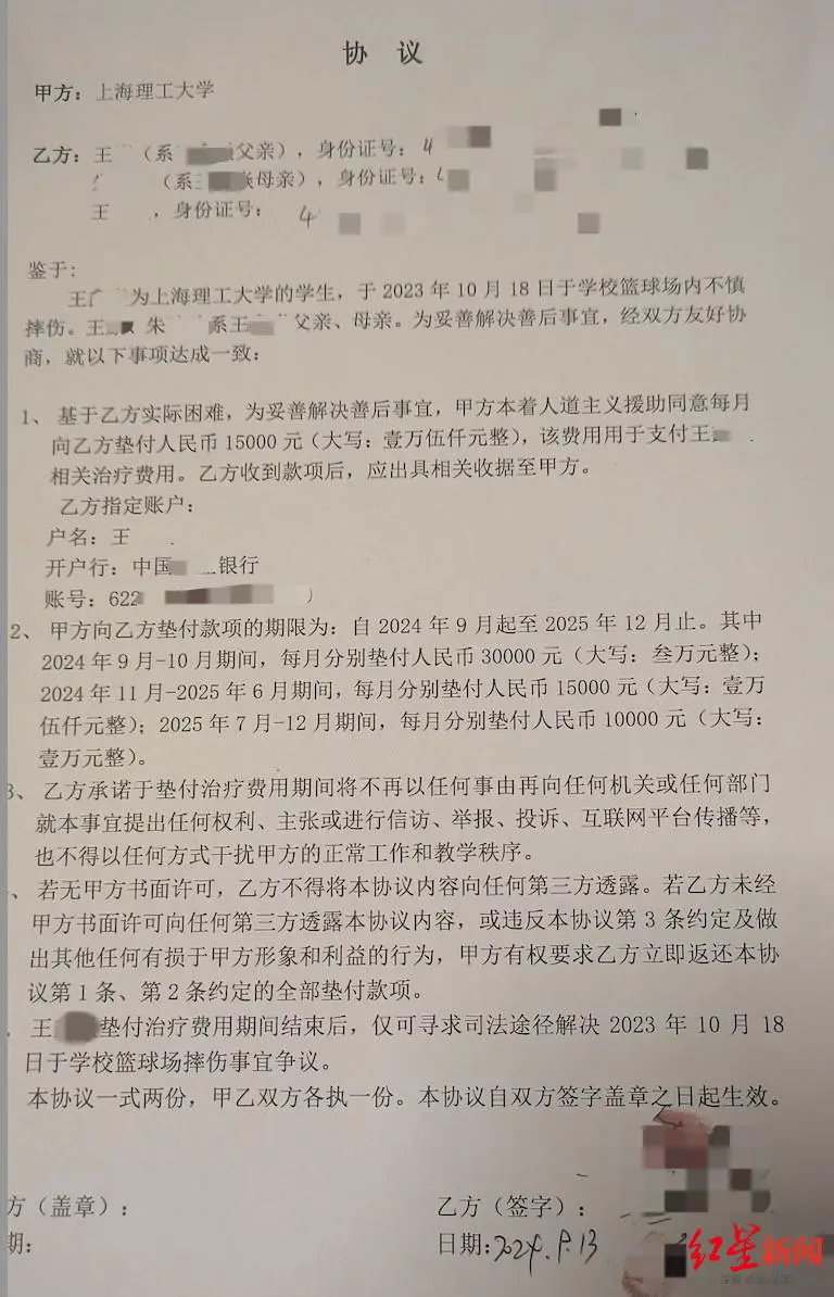 今年9月中旬,王辉和父母两次前往学校,与学校学生处和学院领导商量“赔偿”。王先生介绍,他再次提出,事故源于“场地隐患”,并提出300万赔偿费用。校方坚持2024年提出的50万赔偿费用。