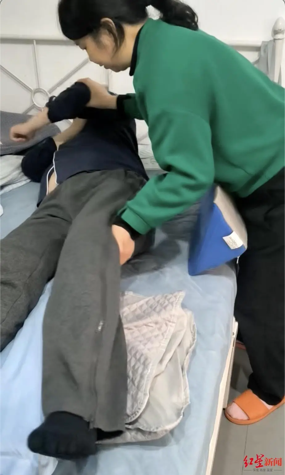 现在,王辉父母给他喂饭、解决大小便,以及做简单康复训练。“只能尽量让他肌肉不萎缩,不生褥疮,以及不要发生病变。”王先生说,四肢瘫痪患者很容易尿路感染,而且心肺功能受损,以至于王辉连鼻涕都擤不出来。