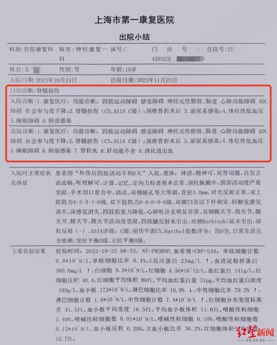 此外,王辉还伴随脊髓损伤(C5,ASIA C级)、颈椎骨折术后、泌尿系感染、体位性低血压、睡眠障碍、肺部感染、肾积水、肝功能不全、消化道出血等多个病症。