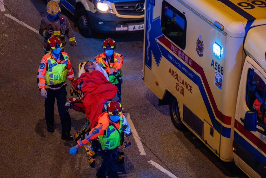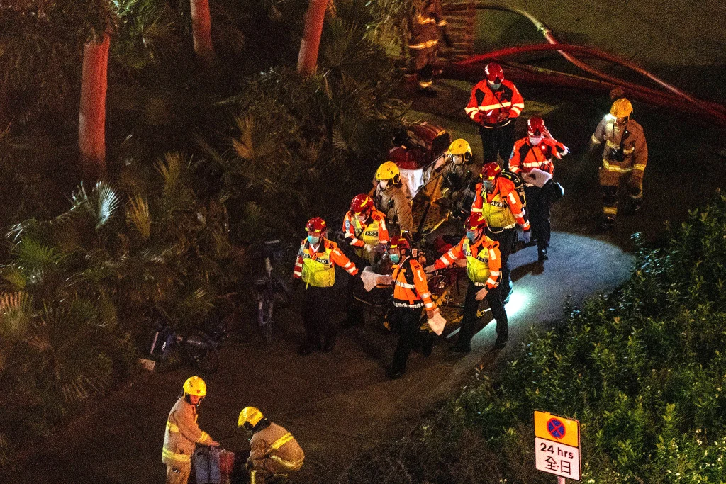 11月26日,香港大埔,消防人员正在火灾现场全力扑救。