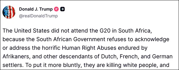 当地时间11月26日,特朗普在社媒车轱辘话重复了一通虚假说法后称,鉴于南非在今年G20峰会期间拒绝将主席国身份交接给一名美国政府代表,他将禁止南非参加明年的峰会,并立即停止对该国的一切援助和补贴。