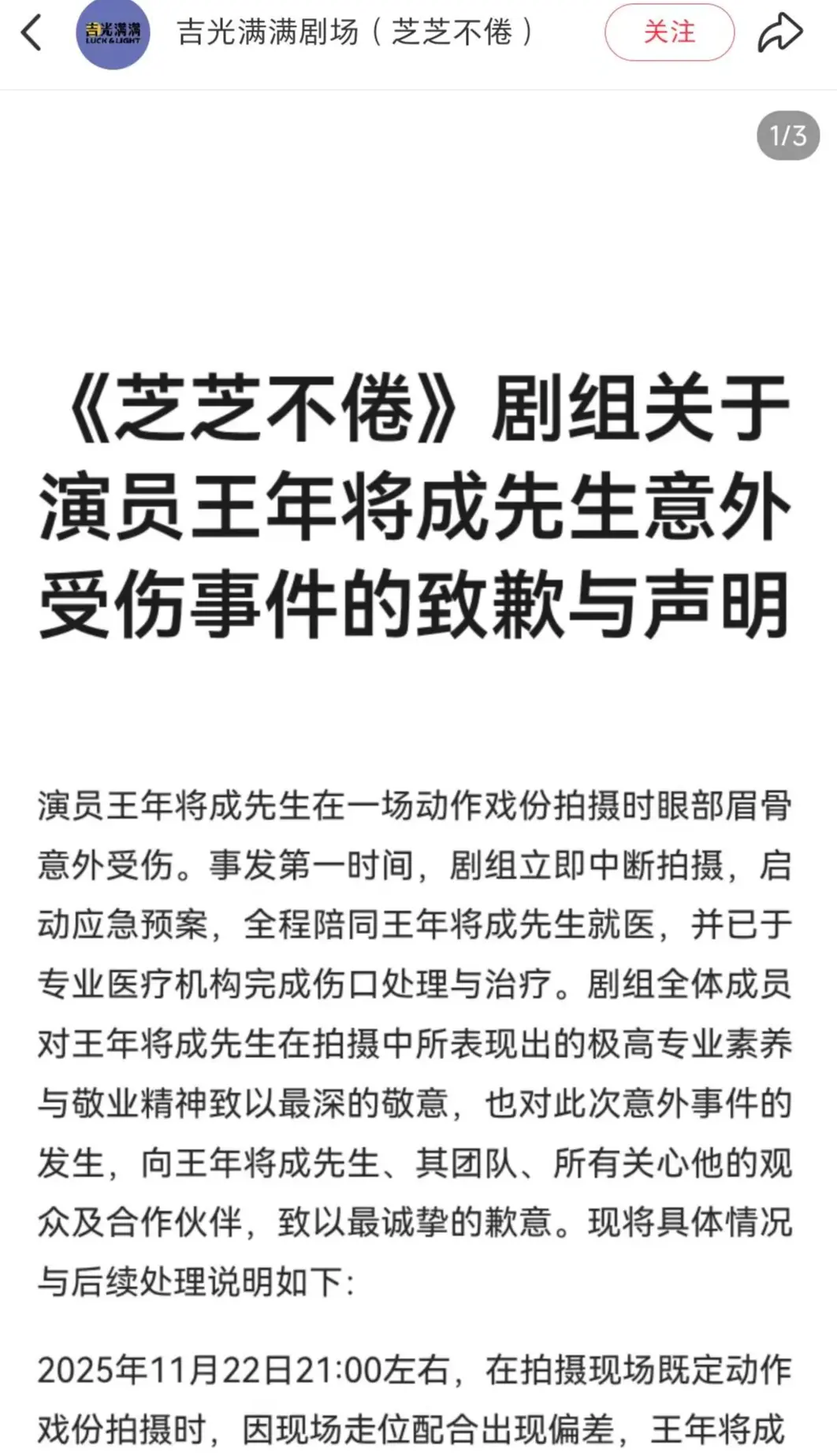 11月22日,前中超门将、短剧演员王年将成拍摄作品《芝芝不倦》期间,在一场对手戏中疑似遭击打导致受伤。同日,涉事短剧剧组发布致歉声明称,事发后剧组中断拍摄,陪同王年将成就医,约1厘米的伤口并已完成缝合。11月23日,王年将成发博公开眼部淤紫肿胀照片,称已到酒店。“大家别担心,会好好休息!!!”