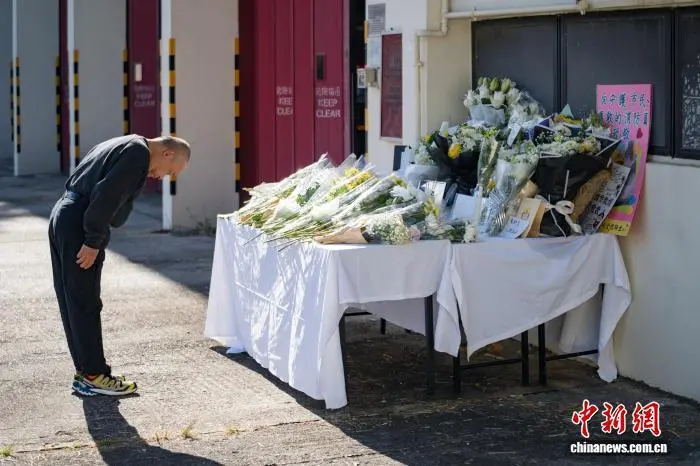 11月29日,香港特区政府消防处沙田消防局外,一位市民向在大埔宏福苑火灾中殉职的消防员何伟豪献花、鞠躬致敬。