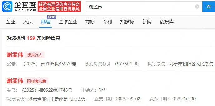 此外,查询企查查APP发现,近期,谢孟伟新增两条被执行人信息。其中,谢孟伟与妻子郭珊珊被湖南省邵阳市新邵县人民法院执行约210万元,与郭珊珊、林某某、祖某某被北京市大兴区人民法院恢复执行500万元。