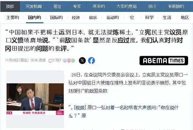 简单来说,原口一博先是指责我国对高市早苗的涉台谬论“过度反应”,接着话锋一转,宣称“日本也掌握着中国稀土的命门”,即使中国拥有100%的稀土资源也没用,因为提炼技术在日本手中,“如果中国不把稀土运往日本,就无法完成精炼。”