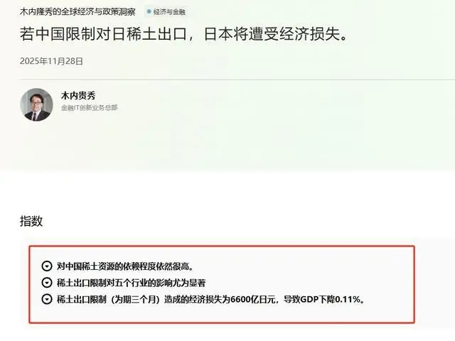 因此,如果中国因高市早苗的涉台谬论限制对日本的稀土出口,日本的汽车、电子元件、风力发电、医疗器械和航空航天五个产业将会蒙受重大损失。