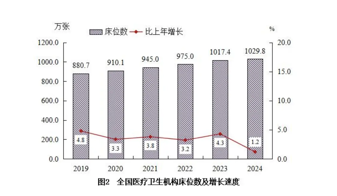 2019~2024年,中国医疗机构床位规模同比增速整体呈现波动中下降趋势,其中2019年和2023年床位数较上一年的增长速度均超过4%,2024年床位数同比增幅降至近六年最低水平,为1.2%。