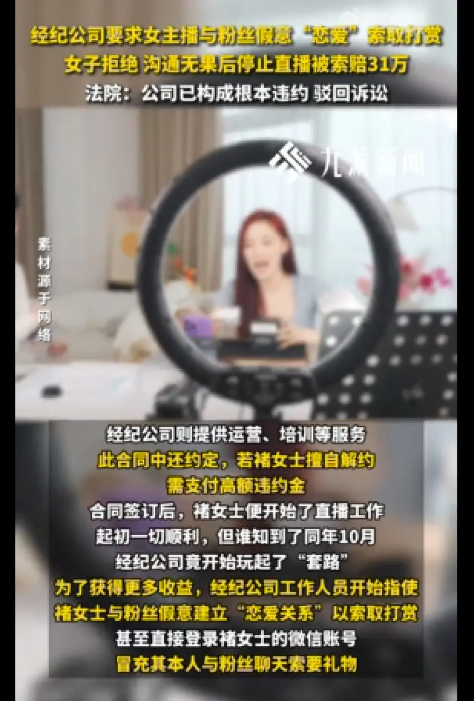 案情并不复杂。褚女士与某经纪公司签订《艺人主播经纪合同》。公司工作人员指使褚女士与粉丝假意建立“恋爱关系”以索取打赏。褚女士明确表示拒绝。在几次沟通无果后,停止了直播。经纪公司认为,褚女士违反了合同约定。遂提起诉讼,要求解除双方合同关系,并向褚女士索赔。法院经审理认为,经纪公司的行为已构成根本违约,判决驳回了该经纪公司的全部诉讼请求。