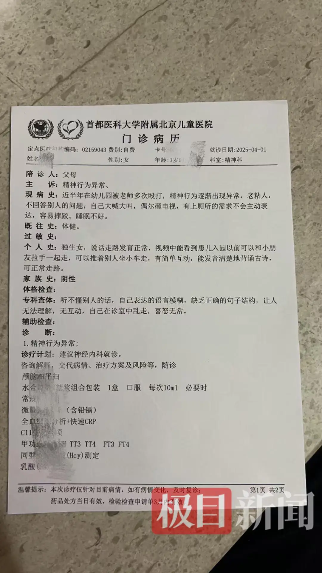 据孟先生提供的盘锦市中心医院急诊诊断证明书显示,他的女儿经头部CT初步诊断为“头皮挫伤”,建议到心理科就诊。今年4月初,孟先生带女儿去首都医科大学附属北京儿童医院精神科看诊,医生诊断为“精神行为异常”“建议神经内科就诊”。