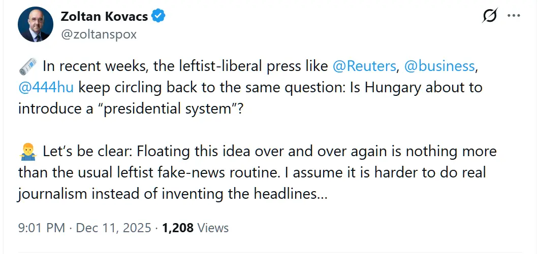 11日当晚,佐尔坦·科瓦奇在社交平台“X”发文就有关消息回应称,“我们要澄清一点:一遍又一遍地散布这个想法,不过是惯用的假新闻套路。”