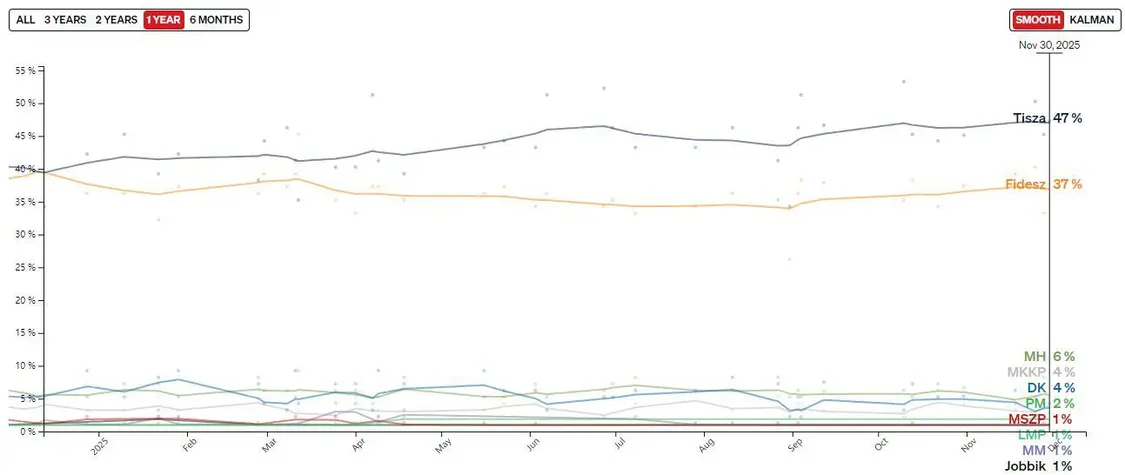 匈牙利主要政党民调,政客欧洲版网站显示,11月底Tisza党支持率超过欧尔班所在的青年党10个百分点 Politico欧洲版