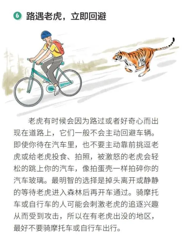 据2024年11月东北虎豹国家公园官方公众号消息,为了应对人兽冲突问题,东北虎豹国家公园管理局编撰了《遇到老虎怎么办?》宣传手册,其中指出,老虎有时会因路过或好奇而出现在道路上,它们通常不会主动回避车辆。即便身处车内,也应避免主动靠近挑逗老虎,或向老虎投食、拍照。最安全的做法是掉头离开,或静待老虎进入森林后再行通过。骑摩托车或自行车的人可能会激起老虎的追逐兴趣,从而遭受攻击,因此在老虎出没的地区,应避免骑行。若意外遭遇老虎,切忌扭头逃跑或弯腰低头,与老虎对峙时应保持冷静,尝试转移其注意力。