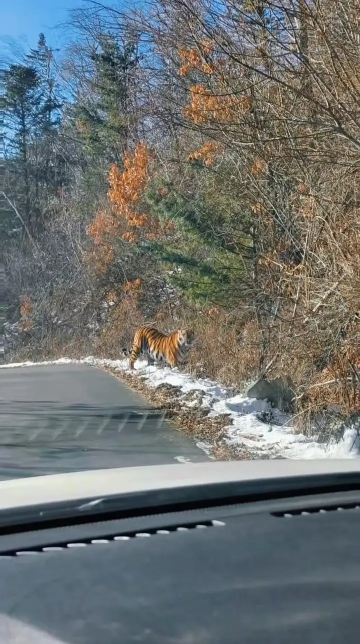 12月11日,有网友发视频称,他在吉林省延边朝鲜族自治州珲春市G331国道自驾时遇到一只“拦路虎”,老虎在道路上缓步而行、四处巡视,疑似一只野生东北虎。