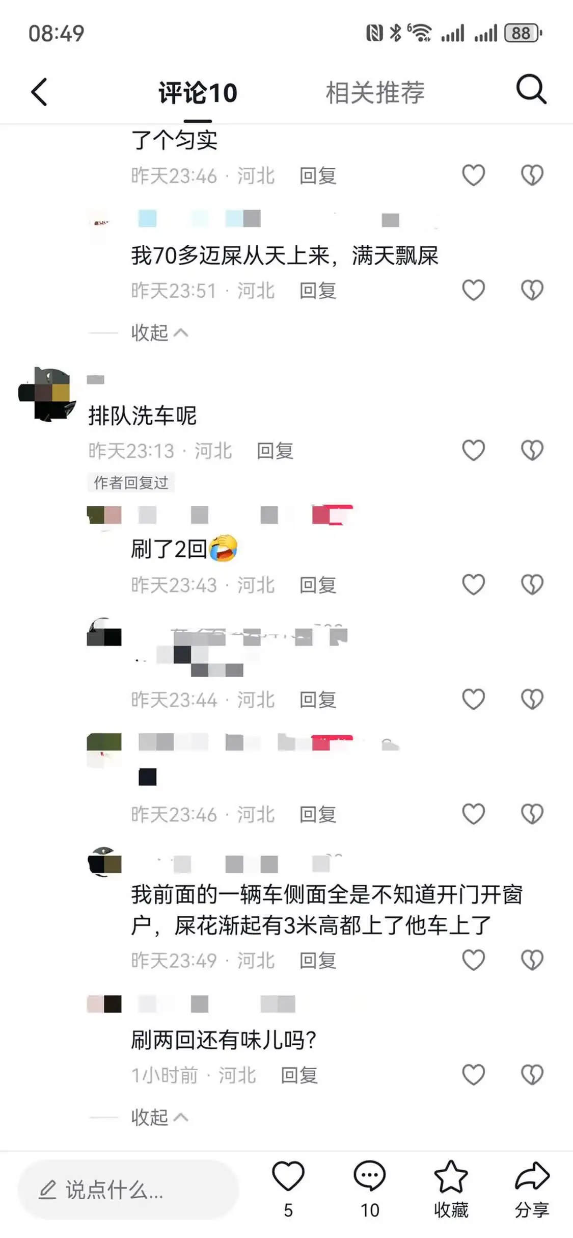 在社交平台,有多名网友发布了自己当晚的“受害”经历。有网友称,当时开车经过还以为是雪,打开窗户看看才知道是大便;有人以为是砂土车的砂土砸车上了,刚打开车门闻到味就想吐了。“我70多迈,屎从天上来,漫天飘屎”“自助洗车店都爆满了”。