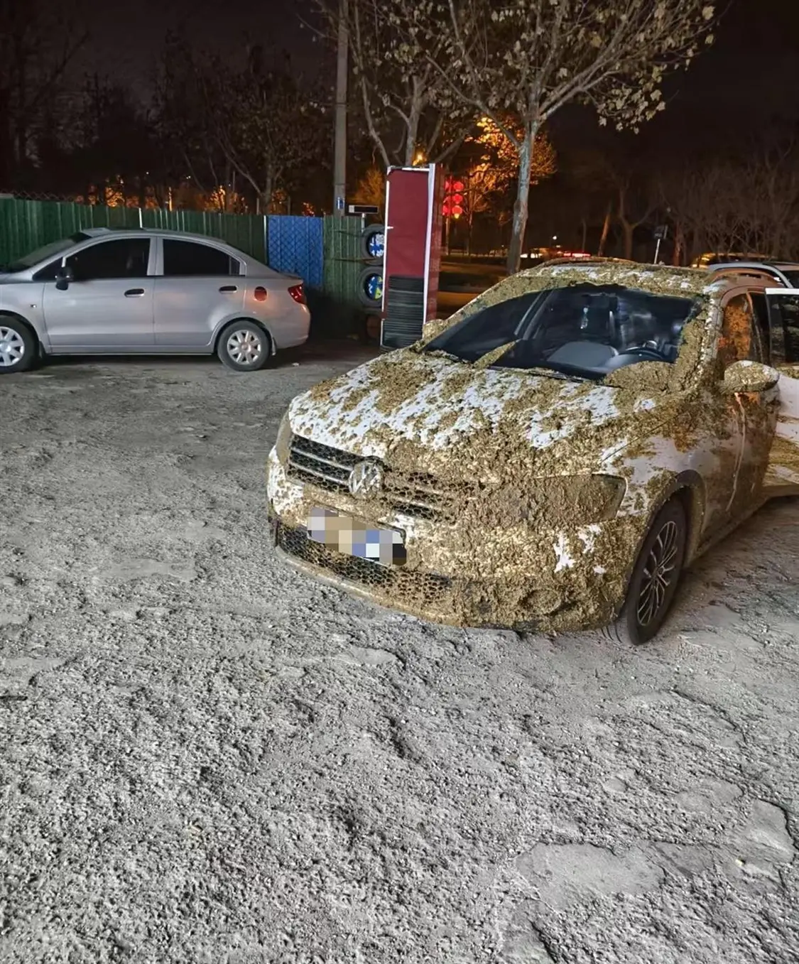网友发布的视频中,有的车辆整个车身都沾满了黑黄色泥状物体。在自助洗车店门口,多台车身有污渍的车辆正等候清洗。另一段行车记录仪拍摄的画面中,行驶过程中突然有“黑泥”甩到挡风玻璃上。
