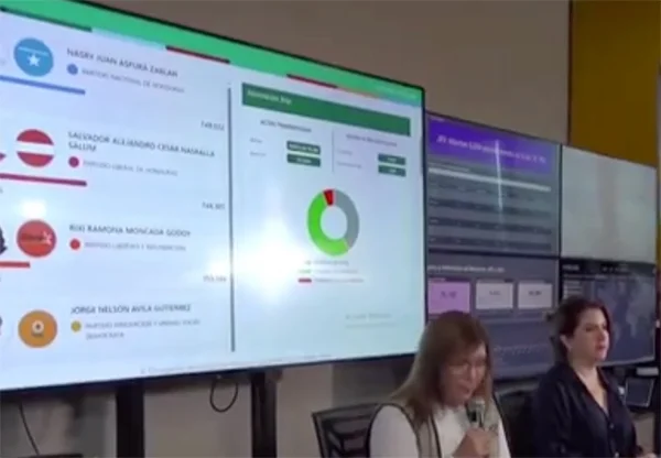 洪都拉斯国家选举委员会主席安娜·保拉·霍尔(左)介绍选举计票情况。 视频截图