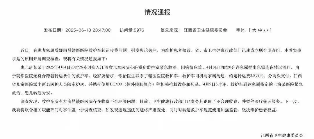 据极目新闻此前报道,今年6月,江西新余市民唐先生曾向媒体反映问题称,4月期间,为将自己患重症的孩子从江西省儿童医院转至上海治疗,通过涉事民营救护车转运,800公里路程被收取28000元费用,且费用直接转入司机个人账户,无任何费用明细及发票,收费合理性存疑。事件引发社会关注后,江西省卫健委迅速核查,后发布通报表示,经调查发现,救护车所有方南昌赣医医院存在收费不合理等问题。目前,卫生健康行政部门已责令其退回了不合理收费,并暂停医疗转运服务。