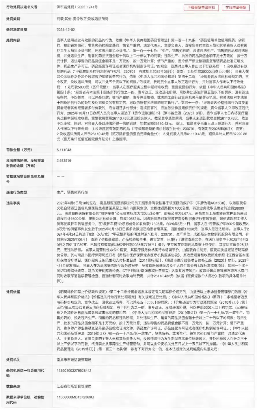 12月16日,极目新闻记者从信用中国网站查询获悉,12月2日,南昌赣医医院有限公司因存在生产销售劣药、医疗服务违规收费等多项违法行为,被南昌市市场监督管理局依法处罚,共计罚款6.1万余元,没收违法所得2.6万余元。