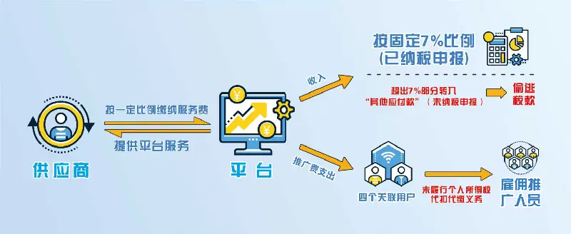 检查人员核实公司账簿发现,该公司与供应商就“嫲嫲团”APP上的货款收入进行结算时,每笔订单都会向商家加收一笔服务费,并将该服务费从“收入”划转向“负债”,藏匿在报表的“其他应付款”科目中。检查人员向公司财务人员询问服务费收取情况,对方表示,“嫲嫲团”交易平台统一就每一笔订单向商家收取7%的平台服务费。