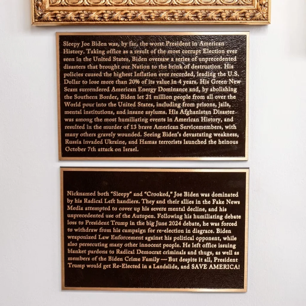 与此同时,铭牌文字还特别提及拜登“任内出现的通货膨胀”,将《降低通胀法案》斥为“绿色新骗局”,并猛烈抨击其移民政策。牌匾内容还提到拜登在2024年总统辩论中的表现:“在2024年6月那场重大辩论中耻辱性地输给特朗普总统后,他被迫黯然退出连任竞选。”对此,拜登办公室拒绝置评。