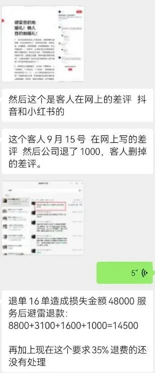 于涛介绍,小红书平台上的不实避雷帖主要分为四类:一是消费者因个人原因违约后,以家人亡故、怀孕等非不可抗力为由要求退还定金遭拒,便发布避雷帖;二是消费者在拍摄、妆造环节签字确认满意后,因冲动消费新增精修照片后悔,为退相关费用恶意抹黑商家;三是产品交付并使用后,以“看着不满意”为由要求退全款,否则便发布避雷帖;四是部分消费者无任何合理依据,仅因看到平台上他人通过发避雷帖成功退款,便跟风发布要求商家退款。