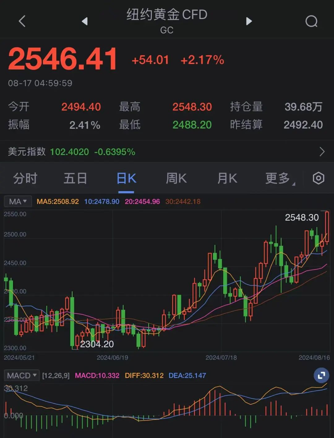 截止收盘,COMEX黄金期货收涨2.17%,报2546.41美元/盎司,刷新历史新高!